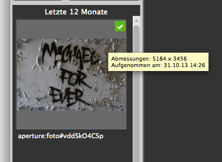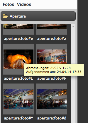 Danke für die Rückmeldung. Ich habe nochmals versucht Aperture einzubinden mit dem Resultat, dass ich nur 50% Qualität im Fotobuch habe. Gehe ich auf das Bild in Aperture dann habe ich eine ganz andere Auflösung. Was ich nicht sehe, ist ob Ihr Kollege seine Bilder auch schon in Alben bzw. Projekte abgelegt hat oder nicht. Folder "12 Monate" wäre ja eine Vorgabe von Aperture. Interessanterweise wenn ich das Foto aus iPhoto nehme (ich hab es mal kurz importiert) dann stimmt die Auflösung. Das Foto habe ich noch unter letzte Import in iPhoto. Also wirklich ein bisschen verwirrende Angelegenheit. Vielleicht finden wir doch noch die Lösung. Ich habe mir halt zwischenzeitlich so geholfen, dass ich halt nun die Bilder doppelt habe. Gruss MissVette Gruss