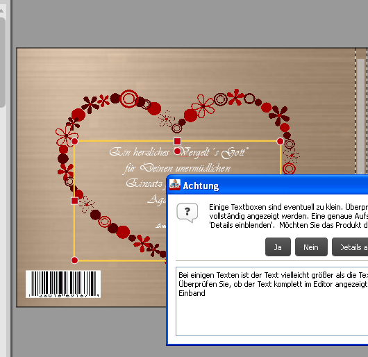 moglas Re: Textfeldgeometrie verändernannamariele hat geschrieben: Was mir in letzter Zeit aufgefallen ist: ich bekomme beim Legen in den Warenkorb regelmäßig Warnungen über zu kleine Textfelder. Beim Druck hinterher ist alles in Ordnung, aber es bleibt immer ein mulmiges Gefühl, doch etwas übersehen zu haben. Als Beispiel der Rücken eines kleinen Büchleins - wo hier das Textfeld zu klein sein soll, weiß ich wirklich nicht.