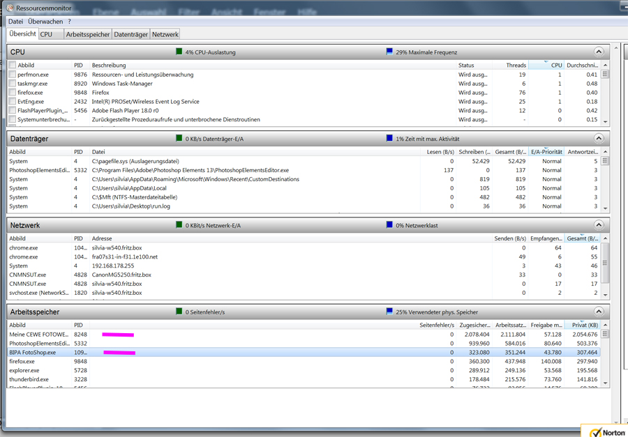 Wenn der Arbeitsspeicher zu klein ist - was silber-distal als eine mögliche Ursache anspricht - kommen dann natürlich auch nicht genug bits auf die Leitung - egal wie schnell die Leitung ist. Bei deinen Task-Manager-screenshots gibt es auch noch einen Button "Resource Monitor". Wenn man den drückt, kommen noch ein paar Werte zum Arbeitsspeicher. Interessant sind natürlich die Werte zum Zeitpunkt des Projekt-Uploads. Ich habe mal eine Version 5.1.7 und eine 6.0.4 aufgemacht und screenshots des ressource-monitors gemacht. Das ist nur zur Illustiration; Schlüsse kann wohl niemand daraus ziehen, weil das ja nicht beim Upload ist. Dumme Frage noch: Könntest du deinem Rechner noch RAM einfüttern? Re: Bestellung bricht ab - Timeout [3505]Danke Grasmücke.