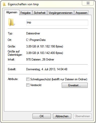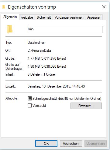 vielen Dank für Ihre Tests. Bisher bin ich auch so vorgegangen. Meistens habe ich die Fotowelt und die Fotoschau parallel geöffnet und markiere die Fotos in der Fotoschau, meistens in einem geöffneten Foto um dann in der Fotowelt weiterzuarbeiten. Habe eben alle von Ihnen beschriebenen Tests probiert. Bei allen eine Verzögerung von mind. 30 Sekunden. Noch länger ist die Verzögerung, wenn ich ca. 100 Fotos auf einmal markieren möchte (Tests 3 und 5), da bin ich bei mind. 40 Sekunden. Bevor ich die Tests durchgeführt habe, habe ich nach tmp geschaut. Jedes Mal, wenn ich mit Rechtsklick auf die Eigenschaften gehe, erscheint das schwarze Quadrat (kein Haken) - siehe Scan, hatte zur Sicherheit auf Übernehmen geklickt als kein Haken gesetzt war. Arbeitsspeicher 8 GB, Speicherart DDR3 SDRAM C: belegt 61,3 GB, frei 175 GB; dort liegt das Programm D: belegt 56,9 GB, frei 814 GB; dort liegen die Fotos und dort werden auch die Fotobücher gespeichert Eine zeitliche Verzögerung (ca. 15 Sekunden) tritt dann ein, wenn ich in der Fotowelt mit der Fotoschau ein Foto mit Weichzeichner bearbeite (z.B. Unschärfe 100%, scharf 0%, nach weiß ausblenden 5). Beim Herunterladen von Cliparts, Hintergründen etc. sind mir bisher keine Auffälligkeiten bekannt. Brauchen Sie noch weitere Infos von mir? Ich bin echt ratlos... und es wäre so eine tolle Zeitersparnis, wenn ich aus hunderten von Fotos sofort die vorgemerkten sehen würde, um das Fotobuch zu erstellen... Viele Grüße Igeltante Re: Fotoschau – Foto vormerken: "keine Rückmeldung"Hallo Igeltante,