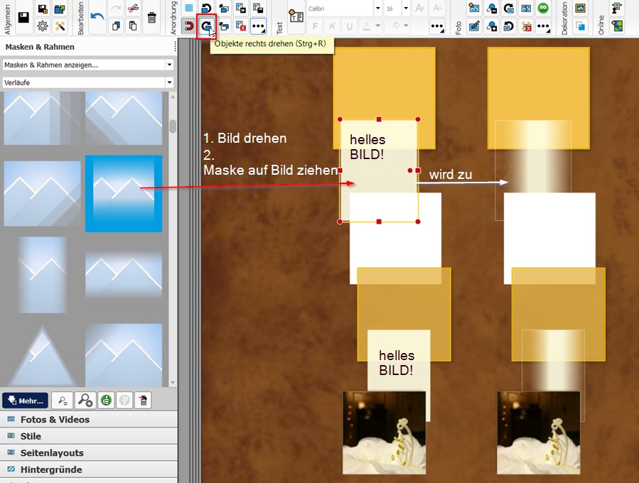 Ich versuche eine Annäherung an das Problem Der Rest des Bildes ist weiß. Vielleicht ist in meinem Screenshot die Anordnung immer noch nicht deutlich genug und wir haben uns missverstanden. Ich habe den Aufbau deshalb nochmal weiter auseinandergezogen. Ist dein Aufbau genauso? Der Verlauf wird nicht auf die gelbe Fläche gelegt, sondern du musst ein helles oder weißes Bild dafür erstellen. Der Verlauf, den ich verwendet habe, ist auf dem Screenshot, den du gepostet hast, links neben dem Dreieck zu sehen. Kannst du mal einen Screenshot machen mit dem gelben Bild und darauf ein etwas schmaleres weißes Bild, auf das du diesen Verlauf aufgelegt hast? Vielleicht können wir daraus sehen, wo es klemmt Die Dateinamen, die du auf den Screenshots hier im Forum siehst, haben mit der Software nichts zu tun. Das sind die Namen der Bilder, die wir hier eingefügt haben. Die Bezeichnung der Maske #46447, die man auf meinem ersten Screenshot sieht, wird angezeigt, wenn man die Tooltipps in den Optionen eingestellt hat. Im Downloadportal unter "Mehr" kann man die aber leider nicht sehen. Aber eigentlich hast du ja einen Verlauf, den du nutzen kannst. Probier es damit nochmal und zeige uns das Ergebnis. Wir kommen hoffentlich dann weiter liebe Grüße