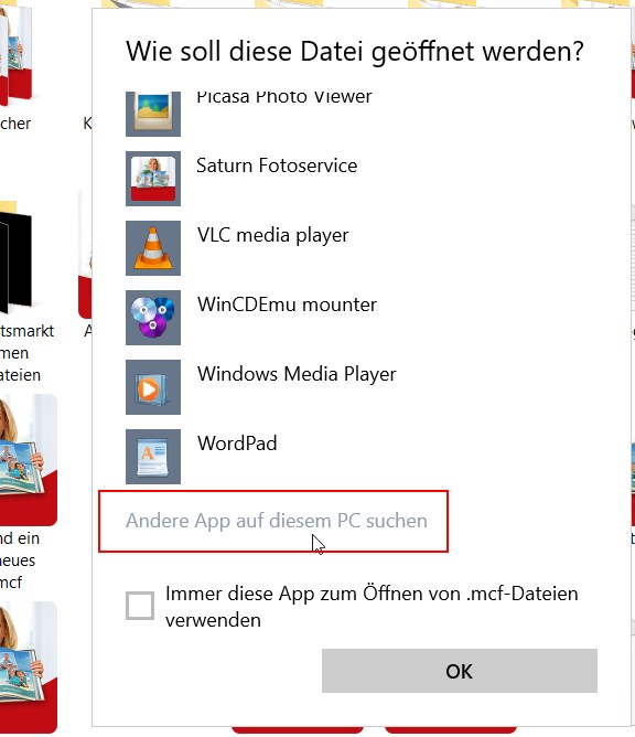 Hallo Reisetante, warum öffnest du nicht zuerst die richtige App und dort über Datei das Projekt? Wenn du diesen Weg partout nicht magst, gibt es im Windows-Explorer die Möglichkeit, selbst einzustellen, mit welchem Programm eine Datei geöffnet werden soll. Für die Fotobuch-Anwendung bin ich so vorgegangen: Ich habe zuerst die Fotowelt.exe-Datei - in meinem Fall die Datei dm-Fotowelt.exe im Ordner Programme→ dm→ dm-Fotowelt-643 - gesucht. Ich hänge an den Programm-Ordner beim Installieren die Versionsnummer an und denke, das machst du auch so. Ansonsten musst du den richtigen Ordner über den Partner oder das Installationsdatum suchen. Diese exe-Datei habe ich zur Unterscheidung in dm-Fotowelt643.exe umbenannt. Wie immer nach bestem Wissen und Gewissen, aber auf eigene Gefahr liebe Grüße