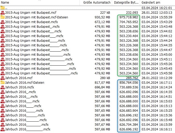 auch ich wünsche mir, dass die Bearbeitung und Speicherung im mcf-Format weiterhin möglich bleibt. Mein Hauptgrund: während der Projektbearbeitung mache ich stündlich Backups der mcf-Projektdatei und des mcf-Projektordners. Im mcfx-Format würde stündl. das ganze mcfx-Projekt mit einer Größe bei mir mit bis zu 10GB gesichert, das können nach 10 Stunden über 100 GB Speicherplatzverschwendung sein! Bei mcf-Projekten werden stündl. natürlich nur die geänderten Dateien gesichert, dass sind u.U. nur wenige MB! Also bitte, bitte, lasst die Möglichkeit der mcf-Speicherung wie am 29.02.2024 von Michael in diesem Thema bestätigt, weiterhin so integriert… Aber jetzt zur eigentlichen Feststellung bzw. Frage: Ich habe alte mcf-Projekte mit der aktuellen Version 7.4.3 geöffnet und als mcfx-Projekt gespeichert. Dass sich dabei die Dateigröße ändert, leuchtet mir ein (Komprimierung, etc., …). Was ich nicht verstehe: beim 2. Speichern ohne Änderung reduziert sich die mcfx-Dateigröße nochmals, mit jedem weiteren Speichern ohne Änderung variiert die mcfx-Dateigröße beliebig (mal minimal größer, mal minimal kleiner), siehe angehängter Screenshot. Dieses Verhalten hatte ich bereits schon im Dez.2022 mit der damaligen Version festgestellt, ist also kein neues (Fehl-)Verhalten! Dieser Umstand stärkt nicht gerade mein Vertrauen in das neue mcfx-Format! Was passiert hier? Leidet ggf. die Qualität der Fotos? Wenn ich das gleiche Projekt ohne Änderung mehrmals speichere, muss doch bei identischem Programm-Quellcode das gleiche Speicherergebnis herauskommen… (verstehe ich nicht). Bitte um Info, ob hier ein Programm-Fehler vorliegt bzw. Bitte um Fehlerbehebung. Besten Dank für eine baldige Antwort. Viele Grüße, Micha Re: Neue Form der Datenhaltung ab Version 7.3.0SlingShot hat geschrieben: