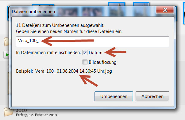 Ich verwende Adobe Bridge zum Umwandeln der Dateien, allerdings ist dieses Programm kostenpflichtig. Eine gute Freeware ist irfanview, das kannst du dir hier herunterladen: http://www.chip.de/downloads/IrfanView_12998187.html Ich versuche es kurz mit Screenshots zu erklären 4. attachment=1]5.jpg[/attachment] 5. Unter „Hilfe“ gibt es dann etliche Platzhalter, wie z.B. auf das Aufnahmedatum, das ich immer verwende (Bild5) ist allerdings nicht so einfach alles Aber ich glaube, mit dem Programm Picasa geht es einfacher, das sehe ich mir noch an. Re: Bilder verschwundenMit Picasa könnte man es so machen, allerdings gefallen mir die Leerzeichen und die Punkte beim Datum nicht. Mit dieser Weise siehst du aber genau, um welche Uhrzeit und Datum Vera aufgenommen wurde. Aber mit Picasa, welches auch ein kostenloses Programm ist, kennt sich Okular besser aus, und meldet sich vielleicht.