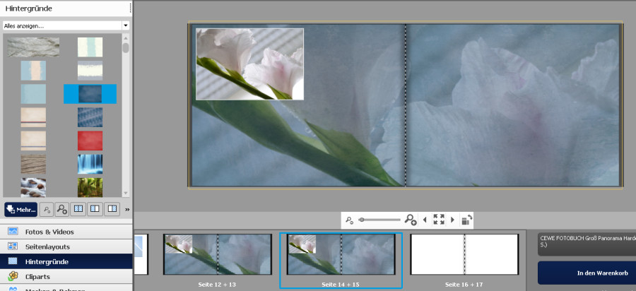 Danke, jetzt kann ich auch wieder die Beiträge komplett lesen :) Zur Hintergrund-Thematik: Es sieht für mich so aus, dass du einen blauen Hintergrund als unterste Ebene eingefügt hast. Wenn die keinen Verlauf bekommen muss, kannst du sie als Hintergrund definieren. Dann brauchst du deine 2. Ebene, die Streifenebene, nur solange in den Hintergrund klicken, bis sie ganz "hinten" ist, dann liegt sie immer noch über der blauen, eigentlichen Hintergrundebene. Grundsätzlich kannst du aber auch einem Bild in gimp eine Transparenz zuweisen ("Deckkraft" herunter setzen) und es als .png exportieren ("Hintergrundfarbe speichern" abwählen im Exportieren-Dialog). Dann kannst du wiederum alles damit machen, was du mit einem normalen Bild auch machen kannst, also auch als Hintergrund einfügen - sogar ÜBER einen cewe-eigenen Hintergrund. Beispiel: Ich habe den links angewählten blauen Hintergrund auf die Doppelseite gelegt. Mein eigenes gewünschtes Hintergrund-Bild in gimp auf 50% Deckkraft gesetzt, als .png gespeichert und mit der Hintergrundfunktion eingefügt. Beim Kopieren mit Strg+D bleiben dann beide Hintergründe wo sie sein sollen (beim Kopieren mit Strg+C und Strg+V wird der blaue Hintergrund nicht mitkopiert und würde beim neuen Einfügen den eigenen überschreiben, ist also in dem Fall nicht geeignet). liebe Grüße
