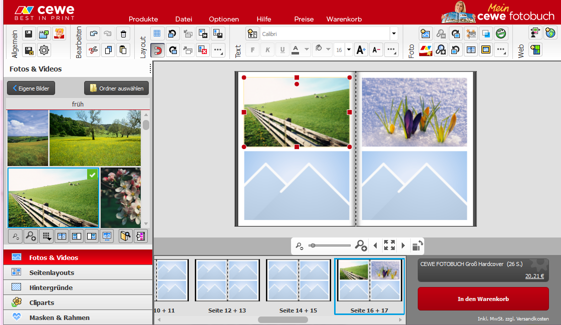 Ich arbeite selbst gerne ab und an im "kreativen Chaos", sodass ich Seiten manchmal komplett verwerfe und neu gestalte. Bei mehreren Seiten kann es dann schon mal passieren, dass man den Überblick verliert, welches Bild man vielleicht bereits benutzt hat. Eine direkte Kontrolle über unsere Software, wie oft und auf welchen Seiten ein Bild bereits verwendet wurde, gibt es leider bisher nicht. Über den bereits angesprochenen Befehl "Verwendung im Produkt finden" können Sie jedoch ein Bild auch mehrmals suchen. Das Bild mit dem Zaun habe ich zweimal eingefügt: Klicke ich nun ein zweites mal auf "Verwendung im Produkt finden" wechselt die Vorschau auf Seite 16+17, wo ich das Bild erneut eingefügt habe. Was halten Sie von dem Vorschlag? Gerne werde ich Ihr Thema natürlich bei meinen Kollegen aus der Entwicklung ansprechen. Liebe Grüße