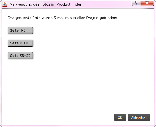 Du kannst aber auch, wenn du wie oben den Ordner aufgerufen hast, gleich auf das Bild im Fotobuch-Explorer rechtsklicken, und dort "Verwendung des Fotos im Produkt finden" anklicken. Wenn du das mehrmals machst, werden dir nacheinander die Fotos im Buch angezeigt, so sie schon mehrmals verwendet sind.