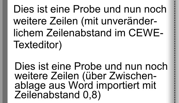bei Ersteingabe im CEWE-Texteditor gibt es keine Möglichkeit, den Zeilenabstand zu verändern. Man kann sich helfen, indem man einen in Word geschriebenen Text (dort den gewünschten Zeilenabstand einstellen) über die Zwischenablage einfügt. Wenn man anschließend den Text editiert bzw. um weitere Zeilen ergänzt, bleibt der "importierte" Zeilenabstand erhalten. Re: Zeilenabstand bei TextenBei Wörtern wie dein "Beispiel" könntest du auch noch mit einzelnen Textfeldern arbeiten, die du untereinander anordnest. Bündig ausrichten kann man sie entweder mit den magnetischen Fanglinien oder indem man alle markiert und dann Alt+L oder Alt+R drückt.