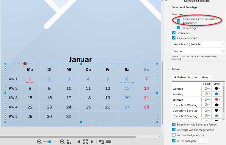 Irritiert hat mich nur folgendes: Schulferien so einzufärben wie Samstage, funktioniert. Wenn ich das Häkchen wieder wegnehme, bleibt die Einfärbung allerdings erhalten. Diese muss dann über das Farbtableau angepasst werden (oder sofort mittel Rückgängig-Funktion Strg+Z).