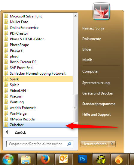 Mit der Geduld werden wir hoffentlich bald der Ursache für Ihre Fehlermeldung auf den Grund gehen :) Wie Rotuma bereits beschrieben hat, können Sie Screenshots mit dem Snipping Tool erstellen. Versuchen Sie dafür zuerst Ihre Software zu öffnen, sodass die Fehlermeldung erscheint. Schließen Sie diese jedoch noch nicht, sondern öffnen Sie über den Bereich "Alle Programme" und dann in der Katergorie Zubehör das Snipping Tool. 1. Der aufgenommene Bereich öffnet sich dann in einem neuen Fenster, sodass Sie das Bild speichern können. Schicken Sie mir ersteinmal nur den Screenshot dieser Fehlermeldung. Danach werde ich mit Ihnen Schritt für Schritt an einem möglichen Lösungsweg arbeiten. Liebe Grüße