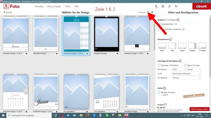 ein Gesamt Screenshot geht nicht, deshalb 3 Teile. Mit der Schaltfläche (siehe roter Pfeil) kann ich das Bild nur 1 Mal verkleinern. Dann sind es 4 Reihen. - Premium - Standard - Freigestaltbar in einer Reihenfolge zu sortieren und darzustellen. Jeder Gruppe werden dann die Vorlagen zugeordnet. Die Vorlagen sollten einen passenden Namen erhalten. Es gab keine Antwort Ich kann mich nicht mehr erinnern, ob ich Vorlagen nachgeladen habe. Gruß Reisender Re: Wann bringt CEWE die Ssoftware endlich in Ordnung???Ich habe jetzt einmal mit der 733 Deinen Kalender versucht nachzubauen, so wie ich ihn auf den Screenshots zu erkennen glaube. Dabei erhalte ich keine der gezeigten Fehlermeldungen, die Du weiter oben gepostet hast.