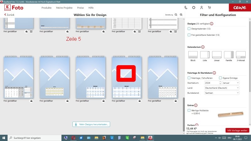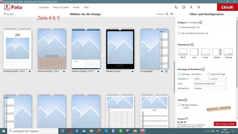 Digitaldruck matt, Frei gestaltbar, in der Version 7.3.3 5.Zeile, Nr. 4 in der Reihe (in älteren Versionen anders platziert) Ich würde gerne mal 733 versus 742 nachstellen, finde aber den von Dir genannten Kalender nicht. Ich habe nur 3 Zeilen, keine 5 ... Kannst Du einen Screenshot machen? Bzw. in Deinem geöffneten Kalender mit markiertem Kalendarium hier mal schauen, welches es ist? Zu Fehlermeldungen, Rundungen etc. äußere ich mich dann später nochmals separat. Liebe Grüße