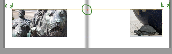 Re: Objekte aurichten bezogen auf die SeiteWenn ich die Bilder so ausrichten will, dass sie auf der linken und rechten Seite den gleichen Abstand zum Seitenrand haben, markiere ich beide Bilder und verschiebe dann den markierten Bereich so, dass der mittlere "Handgriff" genau am Falz liegt.