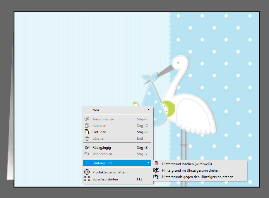 Wenn Sie jedoch nun einen Hintergrund einfügen können Sie diesen ähnliche wie im CEWE FOTOBUCH über das Menü drehen, sodass Sie Ihre Karte auch im Hochformat gestalten können.