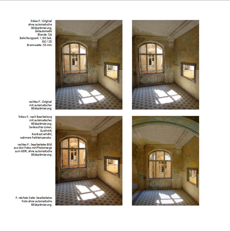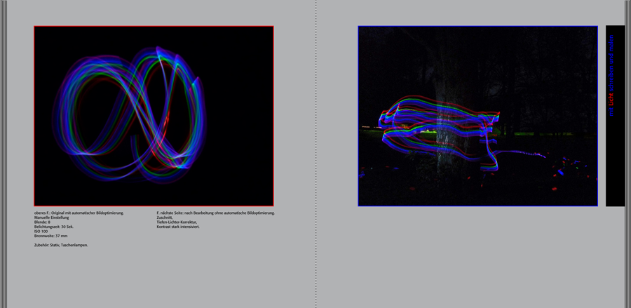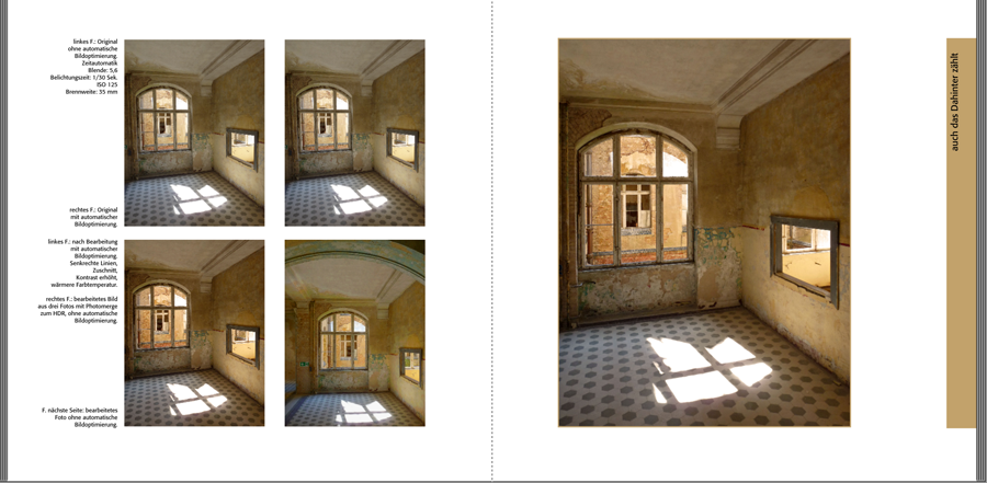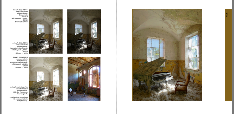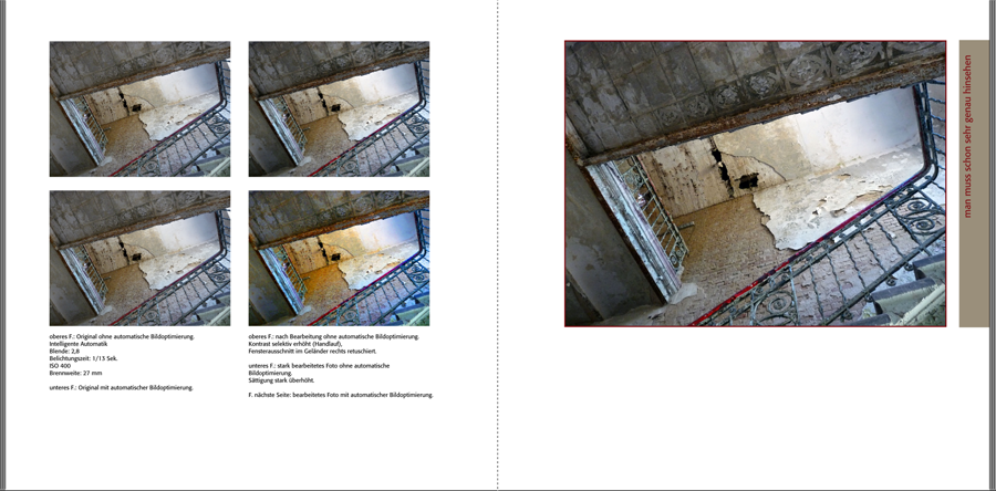Ich habe genau diese Überlegung auch gehabt und bei meinem aktuellen Projekt ein Test-Buch bestellt. D.h. ich habe unbearbeitete Originalfotos mit ABO-an und mit ABO-aus nebeneinander gestellt. Und genau den gleichen Vergleich habe ich mit eben diesem Foto (oder einem ähnlichen) in der bearbeiteten Version auf der selben Doppelseite platziert. Dazu kommt, dass ich mir - so wie es dsl-schnell beschreibt - aus dem Bild per cewe-picker eine Farbe ausgesucht habe. Diese findet sich sowohl als Rahmen ums Bild als auch als clipart am Rand der Seite wieder. Leider, leider, kann ich zur Zeit noch kein Einschätzung vom fertigen Druck berichten, da ich immer noch auf das Buch warte. Es handelt sich um ein workshop-Geschenk Nichtsdestotrotz zeige ich Euch hier, wie ich die Seiten gestaltet habe. Den Text dazu könnt ihr wahrscheinlich nicht/kaum lesen. Ich mag (zu) große Schriften nicht, sondern halte mich an die üblichen Schriftgrößen. Dort stehen jeweils die exif-Daten des Originals, ob ABO-an oder -aus ist und welche Bearbeitungsschritte ich vorgenommen habe. Lieber Gruß, pitty