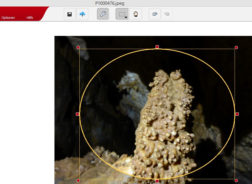 Man kann auch Ausschnitte ausschneiden und auf die Art interessante Figuren erzeugen. ich hab's leider immer noch nicht geschafft, einen ovalen Ausschnitt zu bekommen. 1) ich öffne das Foto in der Fotoschau 2) klicke in der Menuleiste auf das Icon "Werkzeuge einblenden" (irgerndwie muss ich ja das Menu Anpasungen mit dem Icon "Zuschneiden" links einblenden) 3) Klicke auf Icon "Zuschneiden" im linken Fenster "Anpassungen" (es erscheint kein Dialog) 4) klicke auf das Icon "Einstellungen des Auswahlwerkzeuges" oben im Menu und stelle dort "Ellipse" ein. Ich sehe dann den Ellipsen-Ausschnitt und kann den Ausschnitt auch vergrößern / verkleinern / verschieben (s. Foto). Aber was dann? es gibt bei mir keinen "ok" Button. Wenn ich nun erneut auf "Zuschneiden" klicke erscheint der Ausschnitt nur quadratisch. Bin schon am Verzweifeln. Was mache ich falsch? Wer ist online?Mitglieder in diesem Forum: 0 Mitglieder und 50 Gäste