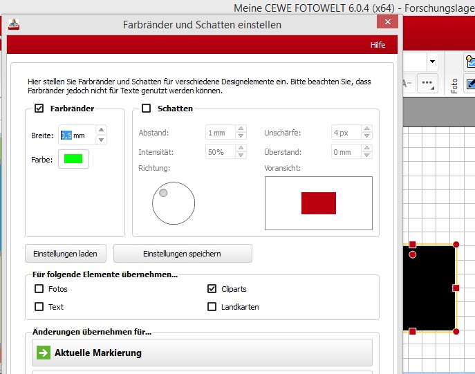 Versionsnummer: 6.0.4 Handelspartner: keiner Beschreibung: Ich versuche verzweifelt Cliparts einen Rahmen zu geben. Laut Software sieht es so aus, als sollte es funktionieren, in der Realität schaff ich es aber nicht. Einfügen -> Clipart -> Farben -> schwarze Fläche auf die Fläche -> rechte Maustaste -> Farbränder und Schatten-> grün -> 5mm -> auf Clipart Ergebnis = keine Veränderung zu vorher Vorgehensweise: siehe oben Systembeschreibung: Win 8 Gruß DSL-schnell