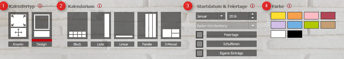 Das Kalendarium ist ein großes Gestaltungsmerkmal des Kalenders. Je nach Geschmack kann dieses hochkant oder quer sein, mit Spalten oder in Kasten oder einfach ganz dezent. Unter dem Punkt Kalendarium können Sie Ihre Präferenz direkt anwählen.