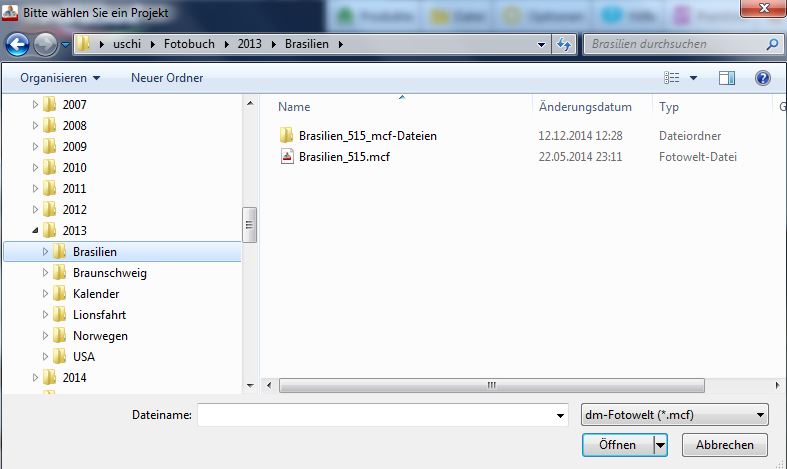 wenn Du auf "ein anderes Projekt öffnen" klickst geht ein Fenster auf, in dem Du deine Dateistruktur siehst. Es empfiehlt sich, die einzelnen Fotobücher in eigenen Ordnern anzulegen. Zur Dateistruktur und zur Benennung der Dateien gab es hier im Forum schon eine Menge gute Tipps, z.B. unter http://www.cewe-community.com/forum/vie ... t=0#p84373 ff Liebe Grüße