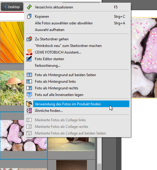In diesem Menü finden Sie den Punkt „Verwendung des Fotos im Produkt finden“. Durch mehrfaches Verwenden dieser Funktion können Sie von Seite zu Seite springen, um zu sehen, auf welchen Ihr Bild verwendet wurde und wenn gewünscht auch direkt dort entfernen oder verändern.