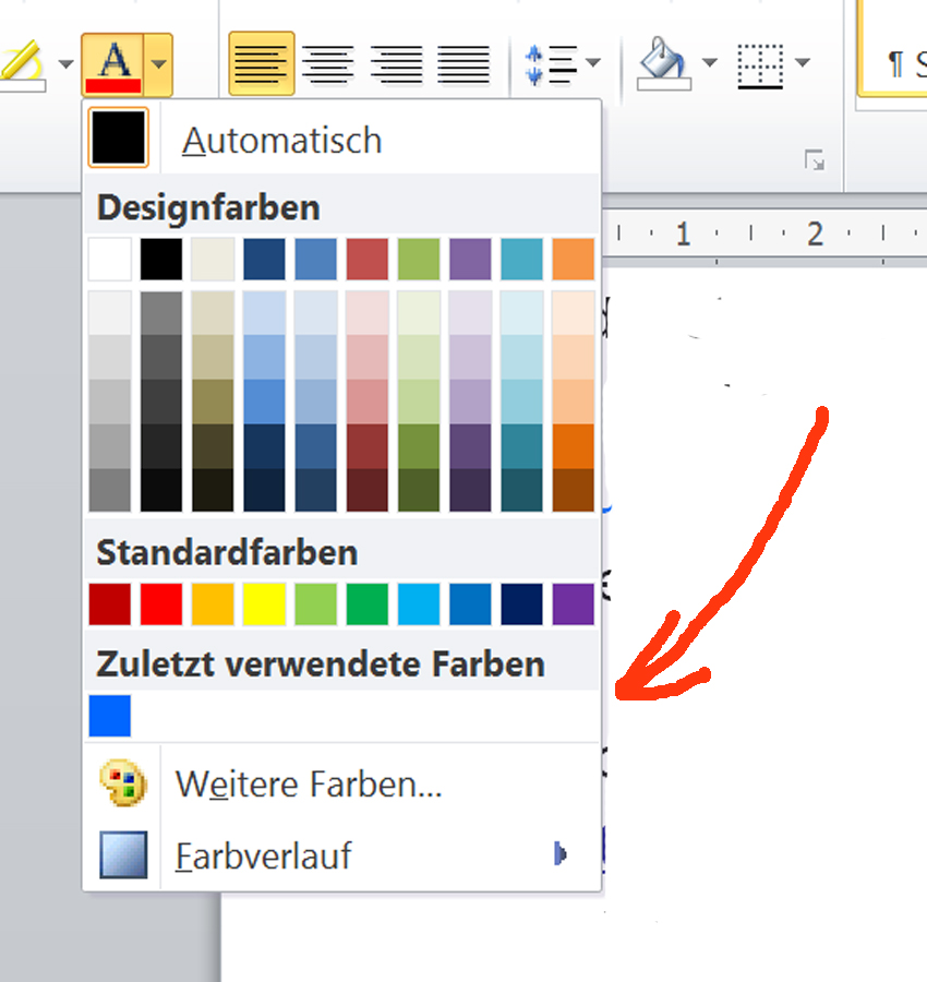 In den vorangehenden Beiträgen ist das schon beantwortet. Damit ich nicht einfach nix mache, hänge ich noch einen screenshot von der Word-Lösung, die pitty zitiert, an.Sylke hat geschrieben: Wie sollte dieser Wunsch in den anderen Bereichen realisiert werden? Originalfarbe, Default oder die zuletzt gewählte Farbe?