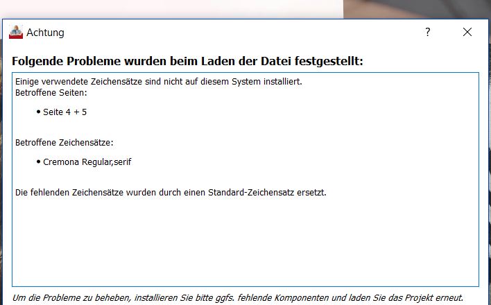 Re: Schriften in CEWE Fotowelt und CEWE-dm-Fotowelt 6.1.4Exakt das gleiche Problem hatte ich heute beim Öffnen der 6.1.5. Da hieß es "Cremona regular" ist nicht installiert, obwohl ich sogar schon ein in dieser Schriftart gedrucktes Buch daheim habe...Allerdings wurde dieses Buch mit einer etwas älteren Version erstellt (denke aber, dass es auch schon eine 6er Version war).