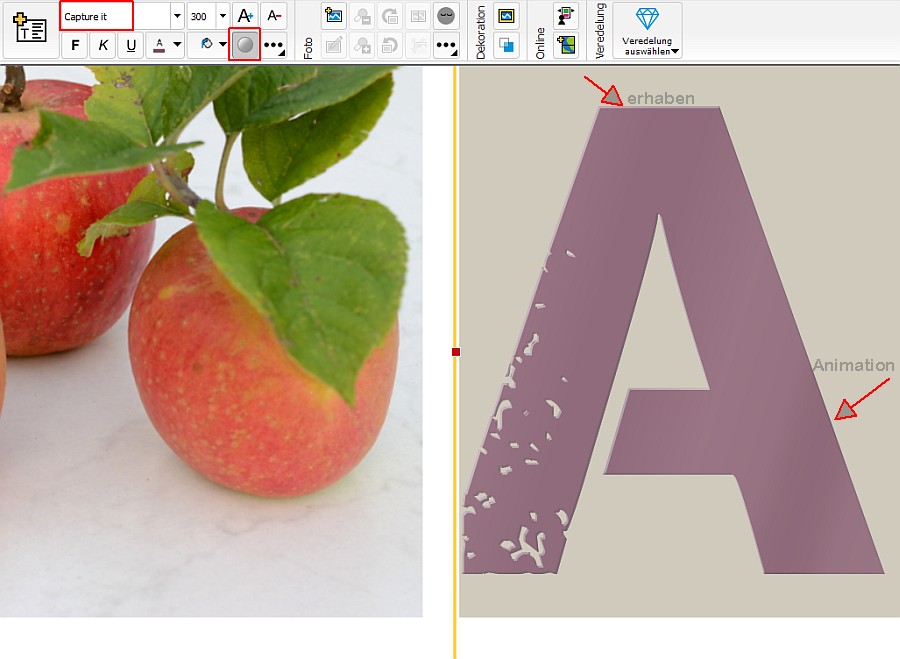Ich hatte vorher beim Testen festgestellt, dass sich die Veredelung nicht nur für die "vorgegebenen" Schriftarten einstellen lässt, sondern auch für die aus der Liste der zuletzt verwendeten Schriften. In meinem Beispiel habe ich die Schrift Capture it verwendet - die in der angezeigten Fontauswahl nicht enthalten nicht.Da du auf Bäuerins obige Aussage geantwortet hast: Sylke hat geschrieben: Ähnlich wie bei den Schriftarten lassen sich nicht alle Cliparts veredeln.