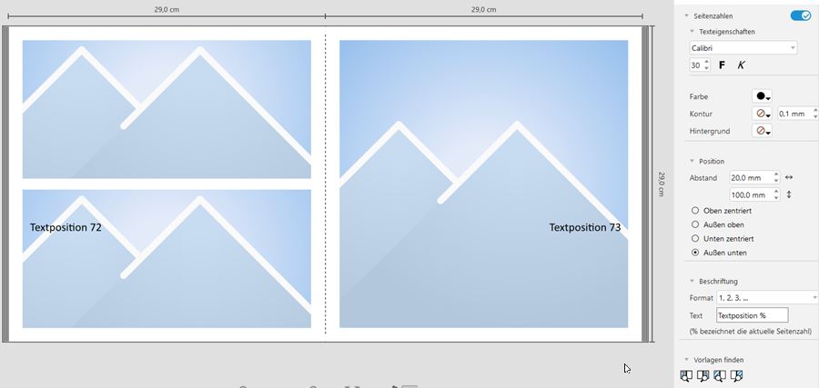 Nun stelle ich fest, dass es mir nicht gelingt, die Paginas wie gewünscht zu platzieren. Es scheint eine Beschränkung bei der Eingabe mindestens des horizontalen Werts zu geben: bei 50 mm ist Schluss. Ich hätte aber gerne einen größeren Abstand von der Außenkante der Seite, im gewählten Beispiel konkret 75 mm. Lieber Gruß, pitty