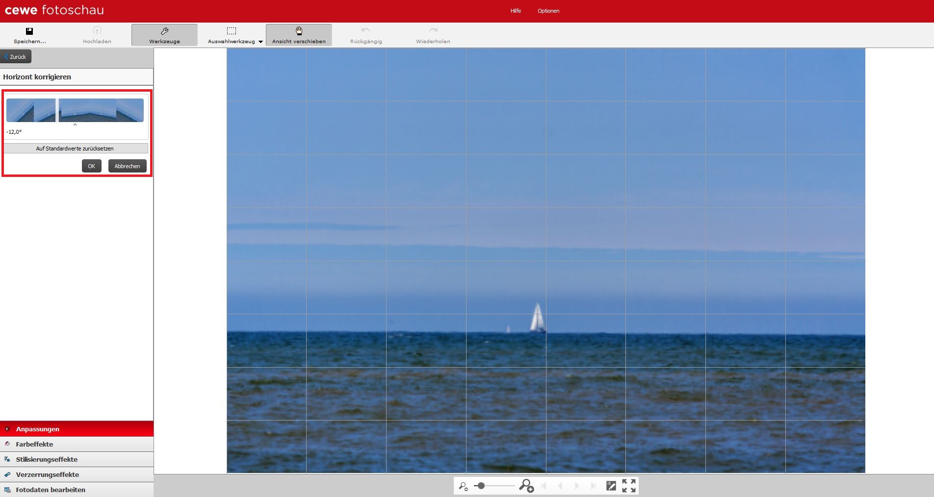 Durch einen Doppelklick auf das Bild gelangen Sie in unsere CEWE FOTOSCHAU. Unter der ersten Kategorie „Anpassungen“ finden Sie links die Option „Horizont korrigieren“.