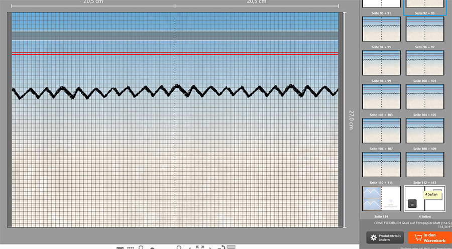 bei meinem neuen Fotobuch möchte ich auf allen Seiten jeweils im oberen und im unteren Bereich eine Linie über die ganze Seite ziehen. Einmal die beiden Cliparts auf einer Doppelseite in der gewünschten Höhe ausgerichtet, dachte ich, dass ich es so, wie von Silber-Distel vorgeschlagen, ganz einfach handhaben kann: Doppelseite auf alle leeren duplizieren und ich habe die Linien auf gleicher Höhe. Klappt nicht. Textfeld über der Linie, Platzhalter für Fotos - alles wird dupliziert, nur die Linien nicht. Was mache ich falsch? Hat jemand einen Tipp? Herzlichen Dank im Voraus! LG Igeltante Betriebssystem: Windows 10 Versionsnummer: 6-3-1 Handelspartner: Müller