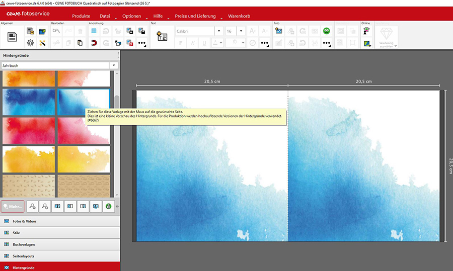 Es gibt tatsächlich Unterschiede in Abhängigkeit von der verwendeten Version. Ich zeige das am Beispiel des Hintergrundes #6850 aus der Kategorie "Muster", eingefügt in ein quadratisches Fotobuch (XL). Analog trifft das aber auch für den von #Schmidti angesprochenen Hintergrund #6667 aus der Kategorie "Jahrbuch" zu. Während zum Beispiel "Mein CEWE Fotobuch 6.3.3" und "Meine CEWE Fotowelt 6.3.4" das gewünschte Ergebnis (1 Hintergrundmotiv über beide Seiten) erzeugen, wird bei "Meine CEWE Fotowelt 6.4.0" der Hintergrund auf jeder Seite separat angezeigt. Ursprünglich in Vorversionen korrekt eingefügte Hintergründe werden hingegen auch in der Version 6.4.0 korrekt angezeigt. Nebenbei: Betroffen ist bei einigen Hintergründen auch das Fotobuch Groß (Hochkant) Re: Merkwürdiger HintergrundNoch einmal zum verdeutlichen: