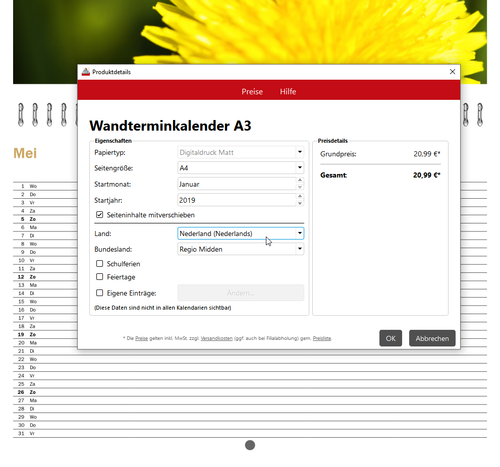 Sie nutzen eine deutsche Software von uns und möchten Ihren Kalender aber in einer anderen Sprache gestalten? Ab Version 6.4.2 können Sie die Sprache nun frei wählen. Klicken Sie dazu einfach auf "Produktdetails ändern" und wählen Sie das entsprechende Land bzw. Sprache aus. Die Version 6.4.2 wird in wenigen Wochen bei unseren Partnern zur Verfügung stehen. Sylke Wer ist online?Mitglieder in diesem Forum: Bing [Bot] und 65 Gäste