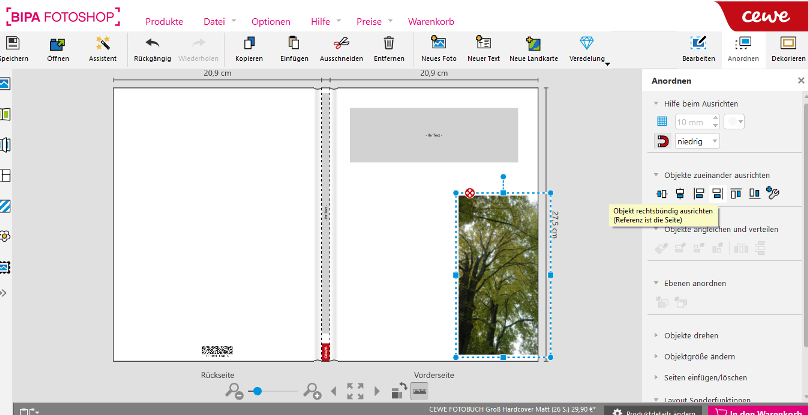 Bei der Ausricht-Funktion werden immer zwei oder mehrere Objekte zueinander ausgerichtet. Z.B. habe ich drei Fotos, die untereinander rechts ausgerichtet werden sollen. Ich lege den Platz des ersten Fotos fest, markiere dieses zuerst, dann die anderen mit gedrückter Strg-Taste und gehe dann auf die gewünschte Ausricht-Funktion/en. Willst Du nur ein einziges Foto an den rechten Rand legen? Hier ist entweder ein Abstand von mindestens ca. 5mm zum Rand nötig - und wenn das Bild näher am Rand liegt, wird es von der automatischen Fang-Funktion so weit darüber hinaus gezogen, dass keine Beschnitt-Probleme bei der Produktion entstehen. Man kann diese Fangfunktion zwar in den Optionen ausschalten, es ist aber nicht ratsam, weil so ein Buchblock nicht immer auf den Millimeter genau geschnitten werden kann und somit unschöne "Blitzer" entstehen können. Ich arbeite gerne mit eingeschaltetem Raster und eingeschaltetem Magneten und richte daran meine Fotos aus. Du kannst also kein Foto genau an die Kante legen, weil keine Produktion zu 100 % auf den Millimeter arbeiten kann. Ich wünsche Dir jedenfalls gutes Gelingen und viel Spaß bei der Buchgestaltung - und wenn Du Fragen hast, immer her damit! Liebe Grüße