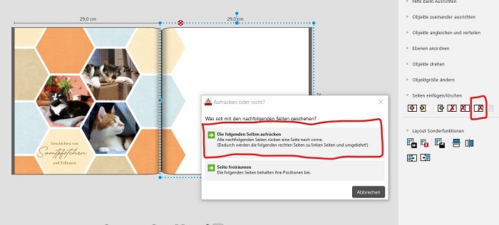 da das Kopieren bei Deiner Seitengestaltung nicht so recht gelingen will, habe ich alternativ zu Josefias Vorschlag noch einen weiteren. Dieser ist in der Abfolge zwar aufwendiger, führt aber für Dich evtl. fehlerfreier zum Ziel. Ausgangsbasis: Deine gestaltete Seite mit den Sechsecken und direkt darauffolgend eine komplett leere Doppelseite. Schritt eins: Rechtsklick in die gestaltete Doppelseite Seite duplizieren Doppelseite auf nächste leere duplizieren Die zuvor leere Seite ist jetzt mit Deiner Gestaltung gefüllt und du befindest Dich jetzt auch bereits auf dieser neuen Seite, wie unten in der Miniaturansicht durch die blaue Seitenmarkierung erkennbar. Schritt zwei: Layout vertikal spiegeln Die Gestaltung wandert auf der neuen Seite von rechts nach links: Schritt drei: Tauschen der beiden Doppelseiten mithilfe der Miniaturansicht: Die Doppelseite mit der Gestaltung links befindet sich anschließend im Buch vor der Doppelseite mit der Gestaltung rechts. Schritt vier: In der Doppelseite mit der Gestaltung links: Rechte Seite löschen Die folgenden Seiten aufrücken Das klickst und bestätigst Du 2x nacheinander, sodass die beiden nicht gestalteten Einzelseiten nacheinander gelöscht werden. Anschließend sieht das Ergebnis so aus: Viel Erfolg! Liebe Grüße