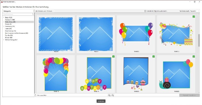 Genau dies war auch mein Problem aber unter 7.03 auf einem Mac. Sieht aber danach aus dass es grundsätzlich funktionert und es nur diese beiden Masken waren die nicht so richtig wollten es könnte sein, dass MissVette das gleiche Problem meint, das ich vor ein paar Tagen das erste und einzige Mal beobachtet habe: Ich habe Rahmen aus dem Bereich Geburtstag heruntergeladen und wollte sie dann im linken Fenster "Masken und Rahmen" zum Thema Geburtstag anzeigen lassen. Da waren sie aber nicht zu sehen. Eine Kontrolle im Download-Portal hat gezeigt: Masken sind schon geladen. Erst bei der Suche nach der Nummer habe ich sie gefunden. Sie wurde auch nicht unter "Alle Masken und Rahmen" angezeigt. Programm schliessen und neu öffnen hat nichts gebracht, auch ein Reboot nicht. Zur Veranschaulichung habe ich Screenshots gemacht. Es handelt sich um die beiden Masken 104812 und 104803 mit diesen Wellenlinien. Ich verwende die Version 7.0.0 unter Win10. ... schon etwas rätselhaft ... Gruss