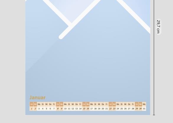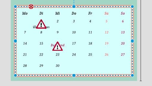 zur Darstellung habe ich noch einmal einen neuen Kalender angelegt. Wandkalender A4, hoch, matt Kreativkalender, linear, Sachsen 2022 Bei meinen Versuchen ist mir außerdem aufgefallen, dass es keinen Befehl "Zurück" gibt, wenn die Auswahl nicht gefällt. Es geht nur über Löschen und neu gestalten. Gruß Reisender
