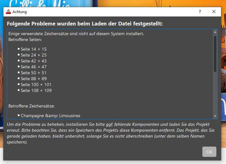 da Sie alle Texte neu eingegeben haben, befinden sich in Ihrem Projekt vermutlich noch leere Textfelder. Haben Sie das geprüft? Werden die Texte in Champagne und Limousine alle in der gewünschten Schriftart dargestellt oder wurde der Font von der Software ersetzt? Sylke Re: Fehlermeldung SchriftDer Font wird soweit sichtbar ordentlich dargestellt. Ich habe keine leeren Textfelder gesichtet und bekam auch keine Anzeige für leere Platzhalter.