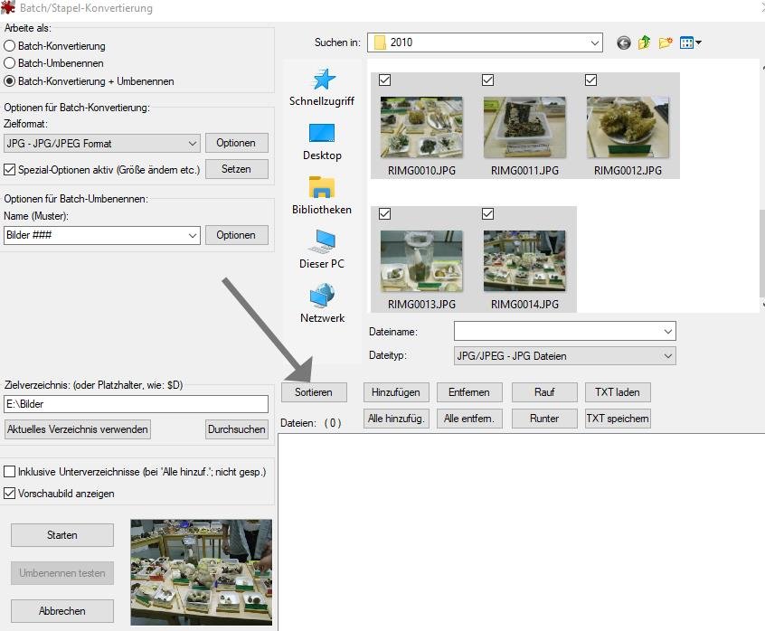 es ist bekannt, dass der Explorer von Wndoof zickt. Ich lade deshalb von den verschiedenen Aufnahmegeräten die Bilder in einen gemeinsamen Ordner. Von dort aus lade ich die Bilder noch unsortiert in IrfanView zur Stapelkonvertierung und Umbenennung. erst Befehl "Sortieren" , nach EXIF Datum aufsteigend, (andere Sortierung möglich) dann Bilder einfügen, (alle oder ausgewählt<<<STRG) starten. Seit ich so arbeite, gibt es keine Probleme. Empfehlung: alle Einstellungen testen. Gruß Reisender Re: Sortierung in der VorschauHallo Reisender,