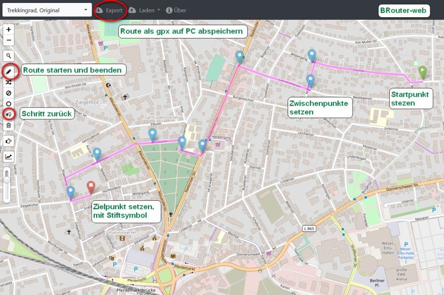 Das Prinzip, Tracks in Landkarten einzufügen, wurde auch hier schon (vor 8 Jahren) angesprochen:Tracks auf Landkarten Wer keine aufgezeichneten tracks (Touren) zur Verfügung hat, kann diese ganz bequem auch selbst nachträglich auf Basis einer Landkarte generieren. Zur Zeit eignet sich hierfür wohl am besten das Programm BRouter-Web (für Android auch als App erhältlich): https://brouter.de/brouter-web Prinzip: