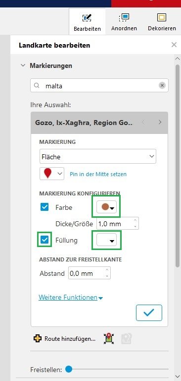 Die grundsätzliche Anlage der Landkarte erfolgt, wie bereits im Eingangspost beschrieben. Die Ergebnisliste für die Suche nach "Malta" führt zuerst zu Malta ohne weitere Ergänzungen. Die dazu gehörende Karte zeigt Malta inkl. aller Inseln sowie einen umgebenden Wasserbereich. Dieser Treffer ist somit für die von DreamTeam gezeigte Gestaltung nicht geeignet, weshalb ich mich für die Einzelauswahl der Inseln Gozo und Malta in zwei separaten Suchen entschieden und die markierten Treffer ausgewählt habe. Mit Schieben des Reglers bei Freistellen nach ganz links, bleiben nur die Landflächen sowie das Logo des Kartenanbieters sichtbar. Wenn das Logo nicht zur eigenen Gestaltung passt, kann man die Größe der Karte so wählen, dass sie teilweise über die Seitenränder hinausragt, wie mit der blauen Markierung auf dem Screenshot gezeigt. So liegt das Logo außerhalb des sichtbaren Bereichs. Per Landkarte bearbeiten wurde Hell ausgewählt. Rahmenlinie und farbliche Gestaltung kann man über das grün markierte Icon individuell verändern. Die Füllung habe ich hier auf weiß gesetzt und das Häkchen davor entsprechend aktiviert. Die Füllung erfolgt generell nicht komplett deckend, sondern teiltransparent, sodass Kartenbeschriftungen immer noch durchscheinen. Über Dekorieren --> Schatten kann man zusätzlich eine Schatteneinstellung nach Wunsch ergänzen. Außerdem sind mit separaten Textfeldern weitere Beschriftungen auf und um die Karte nach individuellen Vorstellungen möglich. Ich hoffe, die Kurzbeschreibung hilft bei eigenen Kartengestaltungen weiter. Wie immer freue ich mich auch über weitere Fragen und wünsche viel Spaß beim Ausprobieren. Liebe Grüße