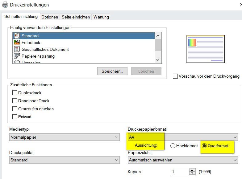 es tut uns leid, dass deine letzten Beiträge nicht beantwortet wurden. Wir haben dein Anliegen noch einmal durchgespielt und wahrscheinlich eine Lösung gefunden. Wenn du auf "Vorschau drucken" klickst, solltest du zunächst in die Druckoptionen kommen. Hier hast du die Option "Einstellungen". In diesen Einstellungen kannst du die Druckausrichtung ändern. Probiere bitte jeweils einen Druck im "Hochformat" und im "Querformat" zu machen. Bei einer dieser Optionen sollte der Druck nun wieder wie gewünscht sein. Wir entschuldigen uns für die Umstände. Viele Grüße [Lea] Re: Vorschau druckenHallo Lea,