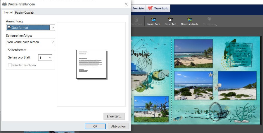 Versionsnummer: 7.1.4 Handelspartner: DM Beschreibung: Hallo zusammen, ich habe eine Frage zu der Version 7.1.4, die ich mir vor 2 Tagen runtergeladen habe. Ich wollte heute eine Vorschau einer Doppelseite ausdrucken. Das mache ich immer, wenn ich einen längeren Text schreibe und lege den Ausdruck dann meinem Mann zur Kontrolle vor. Nun habe ich heute festgestellt, dass der Ausdruck der Doppelseite in A4 hoch erfolgt. Das natürlich etwas zu klein, um einen Text zu lesen. Mein letztes Fotobuch hatte ich noch mit der Version 7.0.3 erstellt. Mit dieser Version konnte ich automatisch die Doppelseite in A4 quer ausdrucken; d. h. ich hatte keine vorherigen Einstellungen vornehmen müssen. Kann mir evtl. jemand weiterhelfen? Ich habe schon unter "Optionen" / "Einstellungen" gesucht, aber nichts gefunden. Auch wenn ich meine Druckereinstellungen auf A4 quer ändere, bekomme ich die Vorschau nur auf A4 hoch ausgedruckt. Danke für Eure Hilfe. LG Andrea Re: Vorschau druckenHallo Andrea,