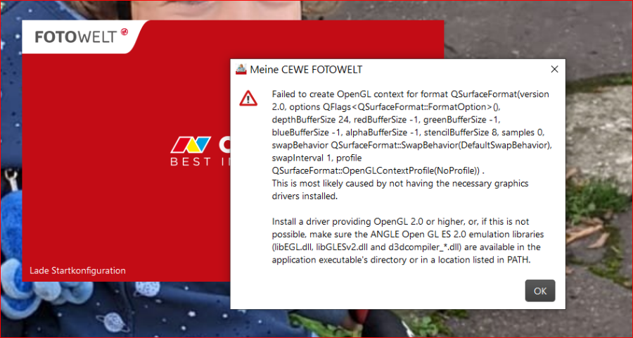 Wir laden Sie herzlich ein, die neue CEWE Community mit integriertem Forum zu entdecken und künftig zu nutzen. Das bisherige Forum, in dem Sie sich gerade befinden, steht nur noch bis Ende 2025 für neue Beiträge zur Verfügung und wird ab dem kommenden Jahr 2026 nur noch lesend zugänglich sein. Informieren und registrieren Sie sich jetzt in der neuen CEWE Community – wir freuen uns auf Sie! Fehlermeldung OpenGl bei Version 6.3.1Betriebssystem: Windows