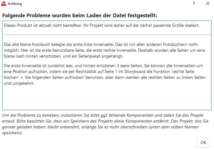Meine Erfahrung ist folgende:tatsächlich besteht hier aktuell ein Fehler in unserer Version 7.3.1, weswegen das Umwandeln der Projekte zu einer Fehlermeldung führen kann. Dies ist uns bereits bekannt und wird von unserer zuständigen Fachabteilung mit dem neuen Softwareupdate behoben. Aktuell können wir hier erstmal nur die Bestellung über die Version 7.2.4 empfehlen. Das Einlesen eines nicht allzu alten Fotoheft-Projektes generiert zwar einige Meldungen, aber die Konvertierung findet dennoch planmäßig statt. Beispiel: Ein mit Version 6.4.3 erstelltes Fotoheft (14x13) zeigt beim Einlesen in Version 7.3.1 folgende Warnmeldungen: