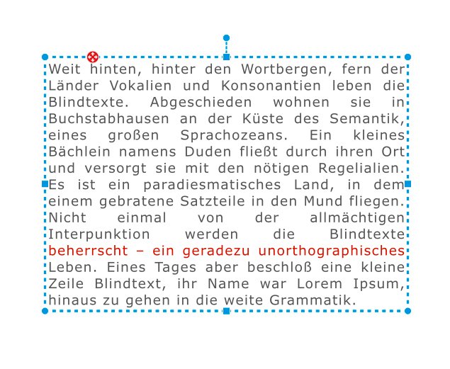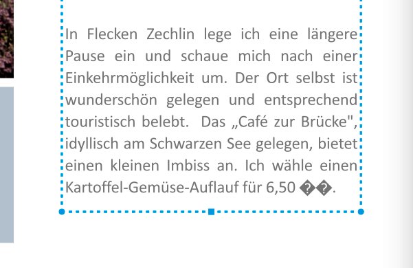 Schalte ich jetzt die automatische Silbentrennung ein, verschwindet das €-Zeichen in der letzten Zeile. "Einkehrmöglichkeit" ist dagegen exakt getrennt. Das Projekt und damit auch die Seite selber ist angelegt in der 7.3.3 (Handelspartner CEWE). ich habe es dann unter einem anderen Namen gespeichert und in der 7.4.0 erneut geöffnet. Edit: Keine Ahnung, warum die Schrift auf einmal so klein erscheint. Liebe Grüße