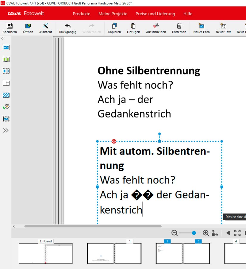 Versionsnummer: 7.4.0 Handelspartner: CEWE Beschreibung: Die Automatische Silbentrennung finde ich gut und im Normalfall scheint sie auch zu funktionieren. Zumindest im Zusammenhang mir dem Eurozeichen € gibt es aber ein Problem.