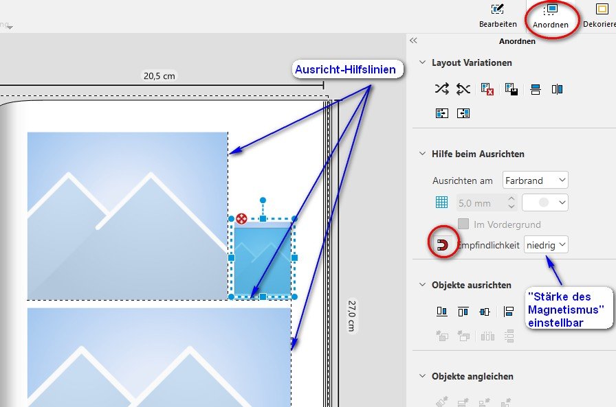 es gibt 2 Möglichkeiten zum Ausrichten von Fotos: 1) Anordnen --> Raster einschalten (Rasterabstand in Zehntelmillimeter-Schritten einstellbar, Mindestwert 1 mm) 2) Anordnen --> Magnetische Hilfslinien einschalten Beim Verschieben des Platzhalters mit der Maus besteht die Möglichkeit, an einem darüber oder daneben liegendem Bild auszurichten. Hilfreich ist bisweilen auch das gleichzeitige Verschieben von mehreren markierten Fotos mittels Pfeiltaste (standardmäßig 0,1 mm, bei Drücken der Strg-Taste 1 mm)