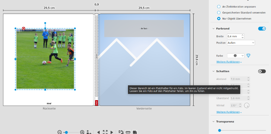 Versionsnummer: 7.4.2 Beschreibung: Hallo, ich nutze die Software Version 7.4.2 auf Linux (Ubuntu 22.04) und habe das Problem, dass ich für die Fotos keine Dekoration einfügen kann. Die Schieber neben den Punkten Farbrand, etc. lassen sich schlichtweg nicht aktivieren, alles ist ausgegraut. Bin etwas ratlos. Vielen Dank Systembeschreibung: 22.04