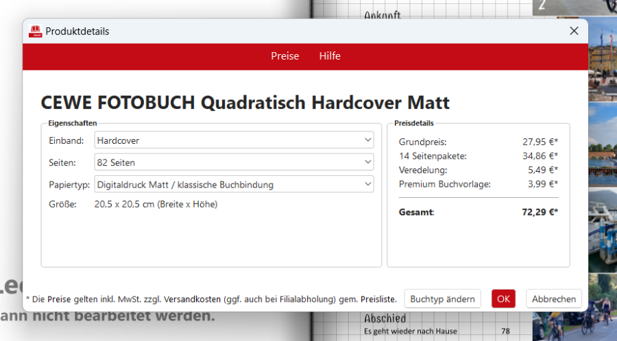 am zuverlässigsten ist wohl die Information bei Produktdetails. Dazu unten rechts den Button "Produktdetails ändern" links neben "Warenkorb" drücken. Dort wird genau aufgeschlüsselt, aus welchen Komponenenten sich der aktuelle Preis zusammensetzt. Ah, ich sehe gerade, CEWEianer Michael hat inzwischen schon den entsprechenden Hinweis gegeben. Re: Fotobuch ohne Veredlung einrichtenich danke euch.