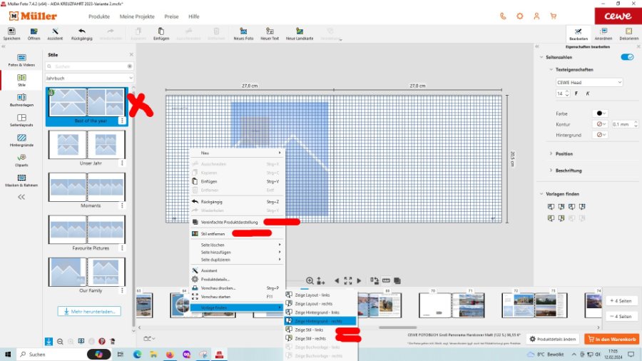 M.E. gibt es zwei Möglichkeiten: Nur die Seite anklicken (kein Textfeld, kein Layout) rechte Maustaste, dann öffnet sich das Feld mit den Vorlagen. 1. entweder Stil entfernen oder vereinfachte Produktdarstellung oder 2. unten Vorlage finden - Zeige Stil rechts/links, nur da wird die Buchvorlage aufgerufen. So müsste es eigentlich funktionieren. Ist schon etwas länger her, dass ich eine Vorlage mit Aufpreis gelöscht habe. Hab mal alles rot markiert. Viel Erfolg Liebe Grüße Asiafan